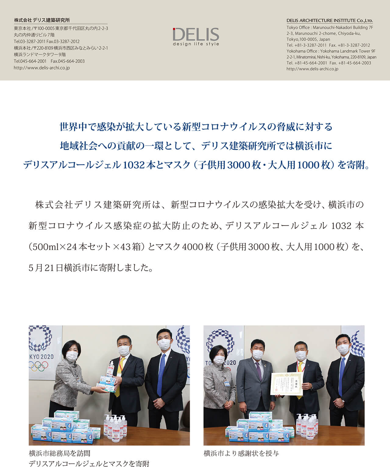 デリス建築研究所は、5月21日横浜市にデリスアルコールジェルとマスクを寄附。