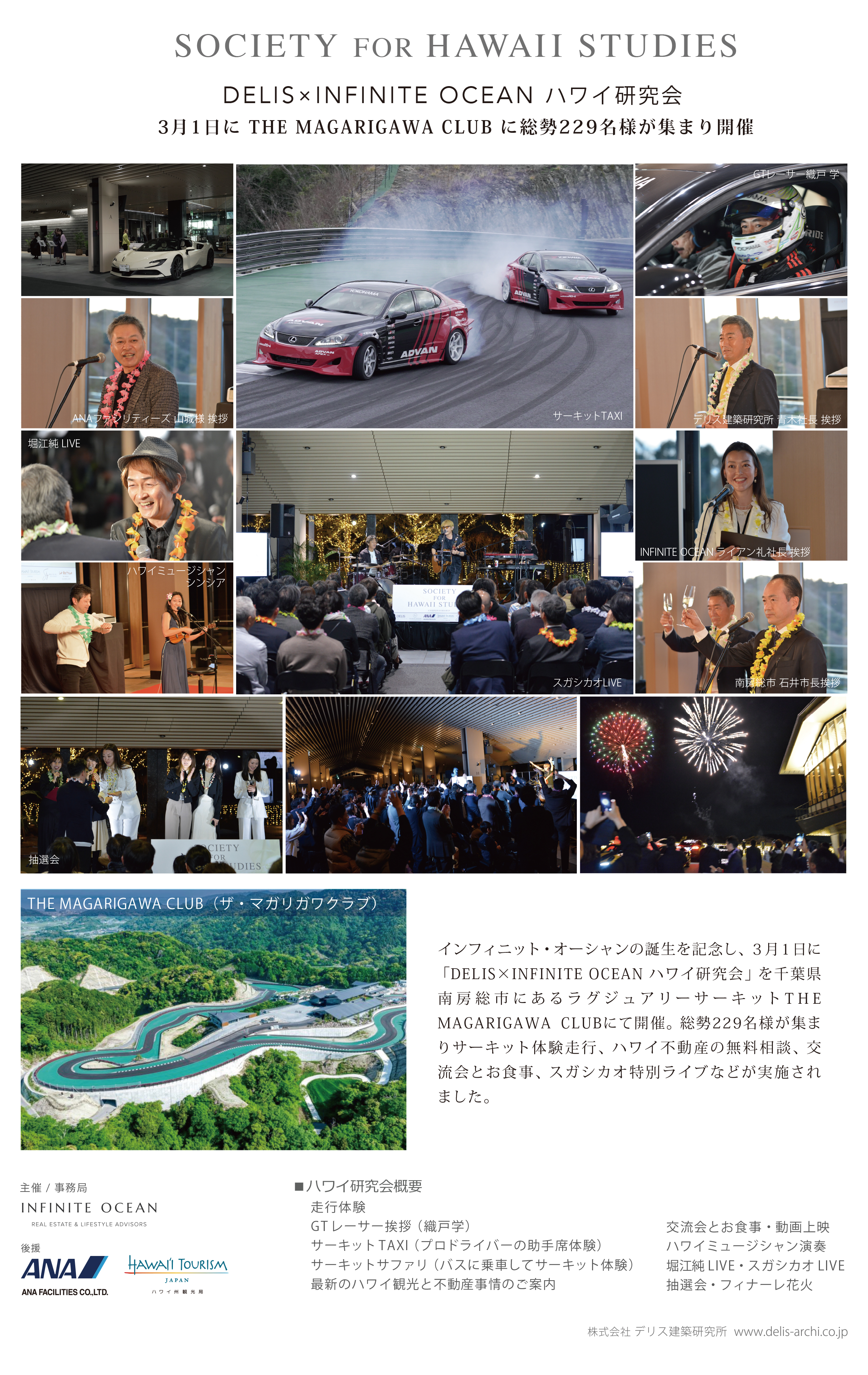 また、INFINITE OCEAN物件を購入された方にはANAのマイルを進呈しています。 インフィニット・オーシャンの誕生記念イベントを開催インフィニット・オーシャンの誕生を記念し、DELIS × INFINITE OCEAN ハワイ研究会」を千葉県南房総市にあるTHE MAGARIGAWA CLUBにて開催されました。記念パーティの模様はこちら