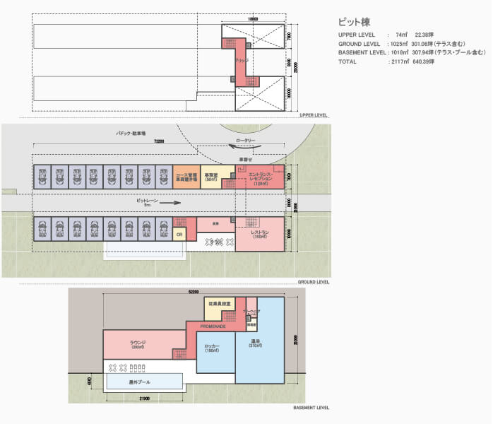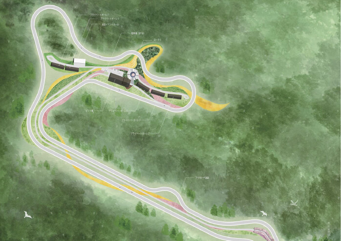 企画段階から参画し、候補地の選定、用地買収取り纏め、行政協議、開発計画および開発許可申請、建築設計を一貫して担当。高低差の大きい敷地条件を活かし、唯一無二のサーキットレイアウトを実現するとともに、景観保全や動植物保護のためビオトープを設置。サーキット、クラブハウス、宿泊施設などを結ぶマスタープランを構築しました。