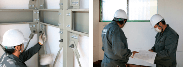 一般財団法人建材試験センターにおいて、シェルキューブが大地震時にも耐震シェルターとして十分な強度を発揮するかを確認するため、実大部材による強度試験を実施しました。